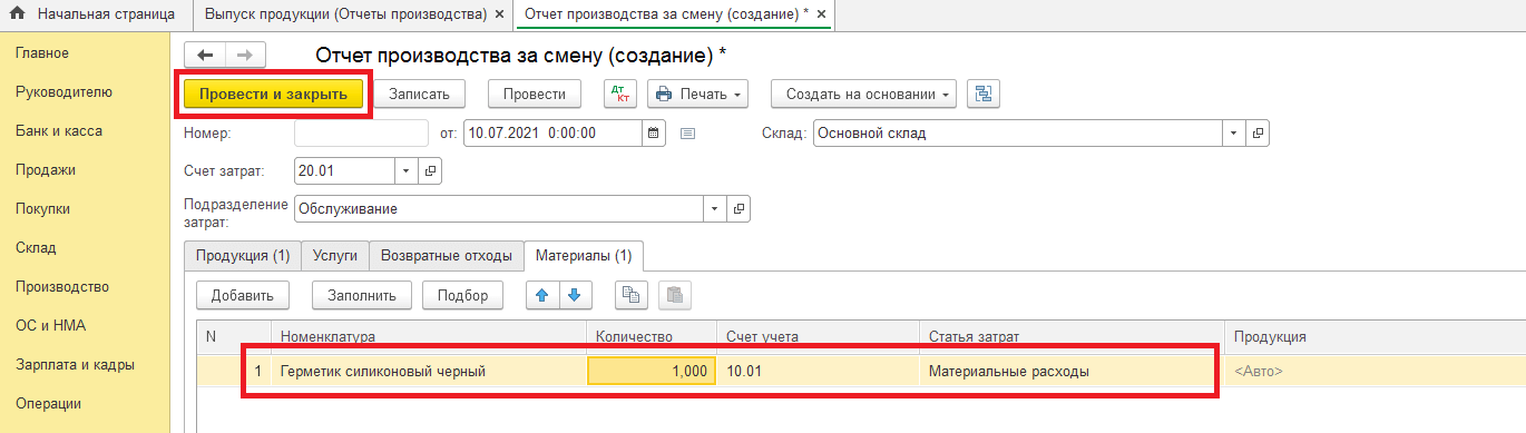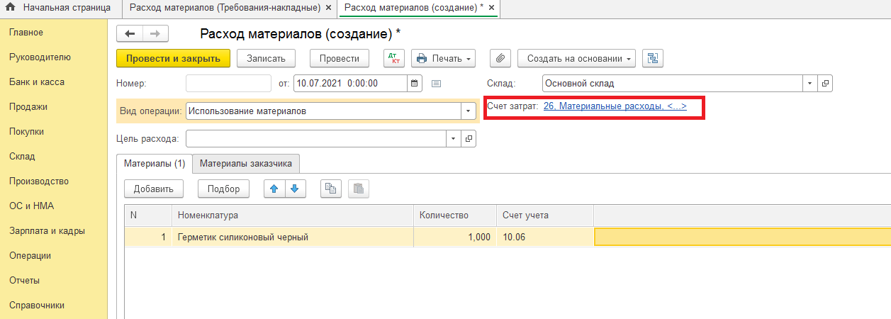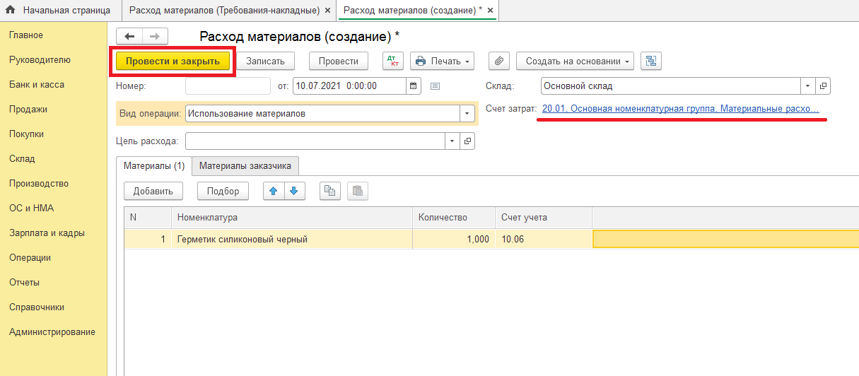 Заполнение происходит аналогично заполнению в предыдущем варианте. Вносим наименование материала (выбираем из общего списка номенклатуры), количество, счет учета, статью затрат. Списание будет происходить на 20 счет. Нажимаем Провести и закрыть.
