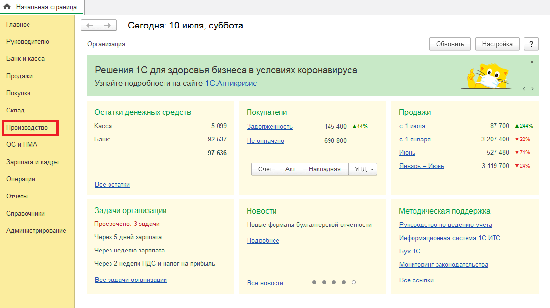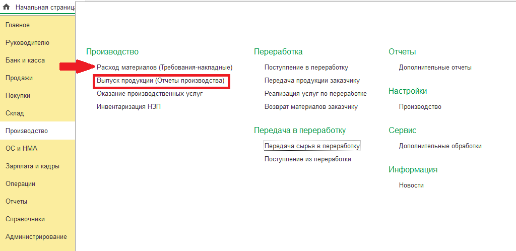 В разделе Производство выбираем Выпуск продукции. Кстати, в этом же разделе есть и строка Расход материалов (Требования-накладные) – аналогичная той, которую мы уже применяли для списания материалов. Так что в эту строку можно попасть как через Склад, так и через Производство. Сейчас мы рассматриваем другой способ списания – через Выпуск продукции.