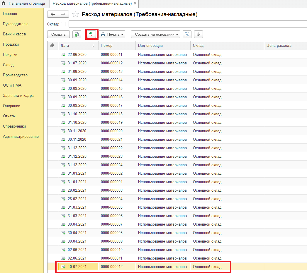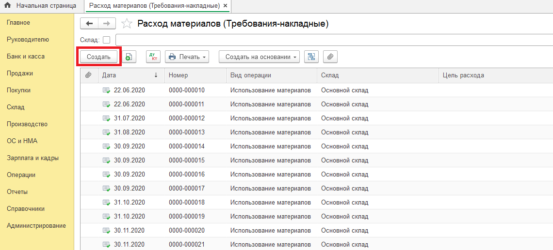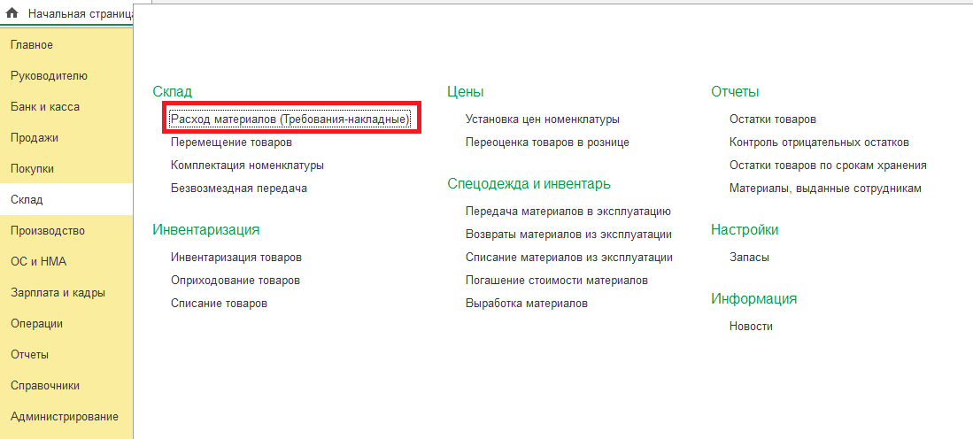 Далее в разделе Склад выбираем Расход материалов (Требования-накладные)