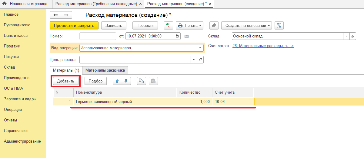 Далее кнопкой Добавить из перечня номенклатуры выбираем материал, который следует списать. Указываем количество и счет, с которого произвести списание.