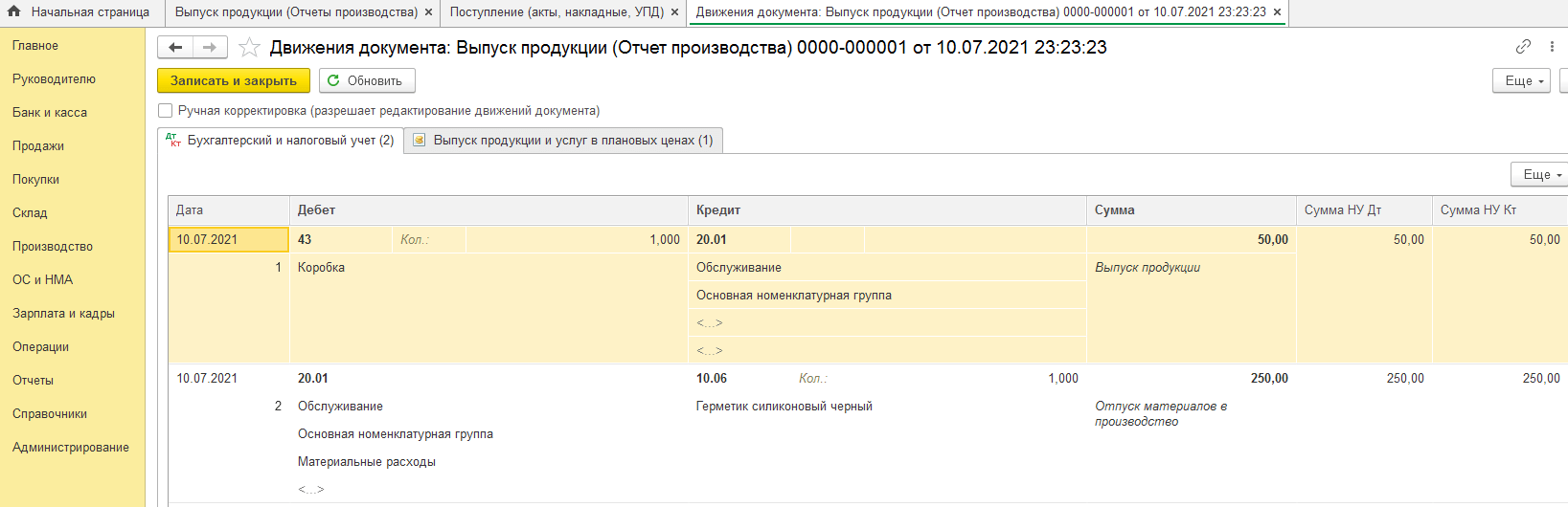 Поверяем проводки обычным способом. Проводки сформированы: материал списан (Кт 10.06) на производство (Дт 20).
