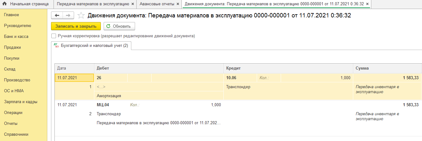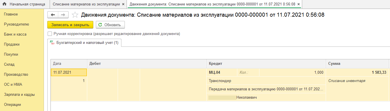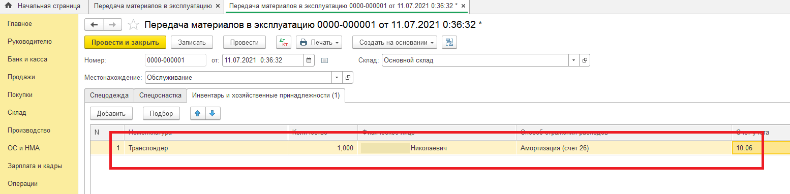 Есть еще один способ списания материалов, учет которых требуется вести даже после списания. Например, это может быть какой-то инвентарь, инструменты и прочее.