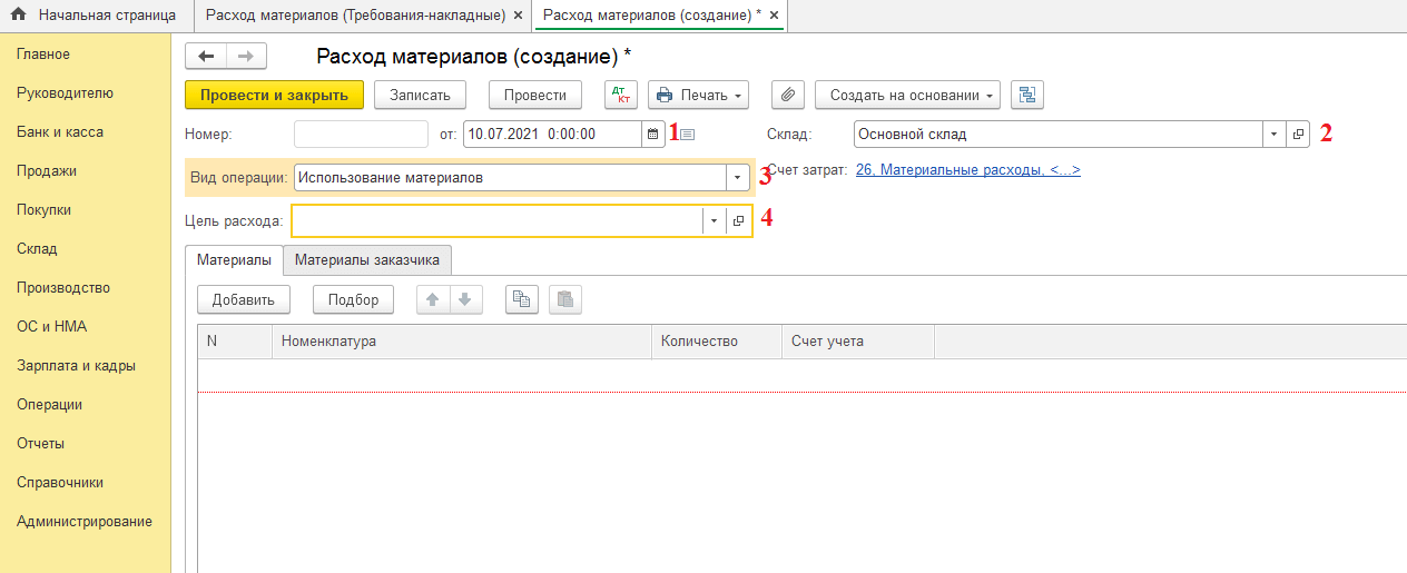 Заполняем форму для списания материалов. Вводим дату списания (1), склад, с которого происходит списание (2), вид операции – использование материалов (3), цель расхода (4) – допустимо не заполнять.