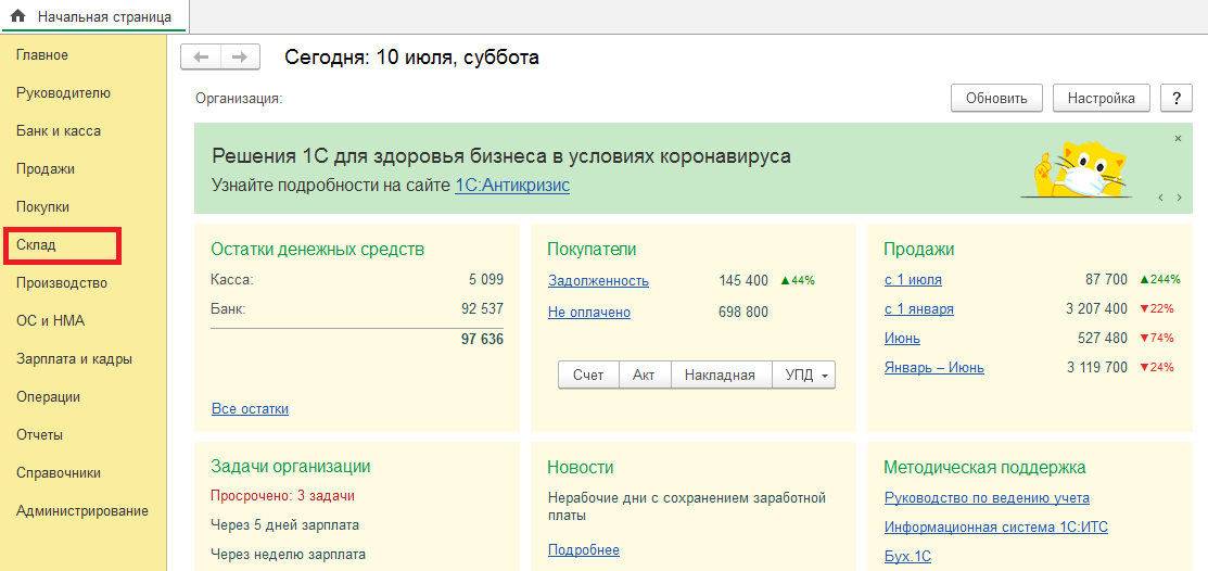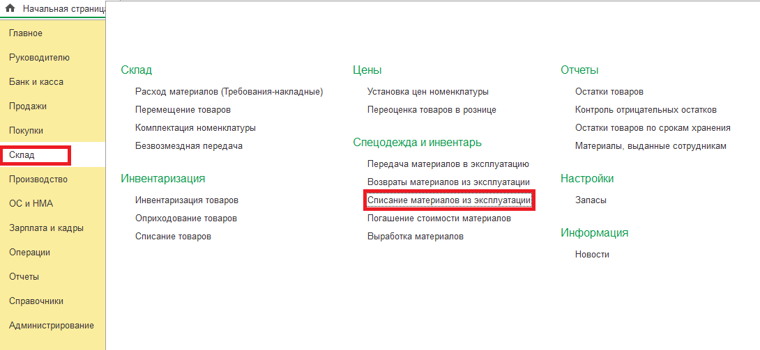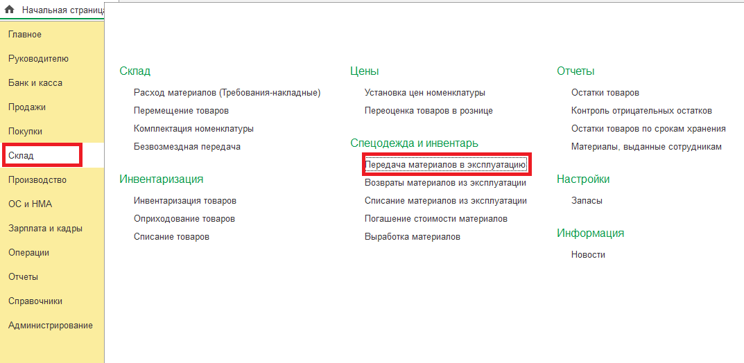 Проходим путь Склад (на главной странице) – Спецодежда и инвентарь и выбираем Передача материалов в эксплуатацию.