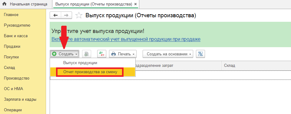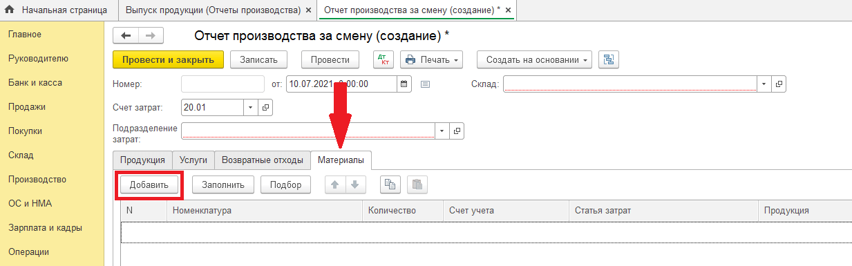 Кнопкой Создать создаем новый Отчет производства за смену. Подробно на этой операции мы сейчас останавливаться не будем, опишем только, как включить в нее списание материалов.