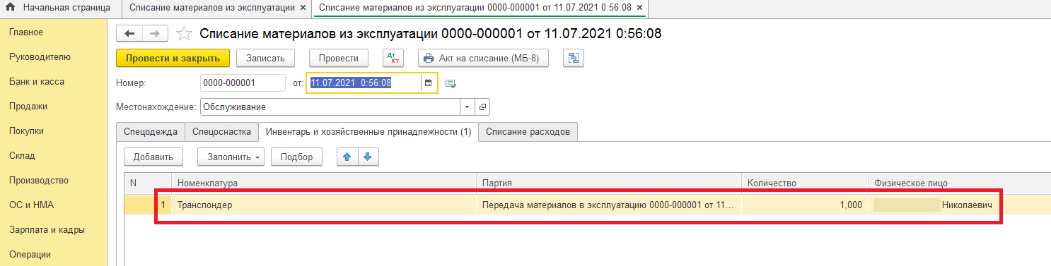 Кнопкой Создать создаем новый документ и заполняем так же, как и все предыдущие. Отличие – надо внести физлицо, которое несет ответственность за списываемый инструмент.