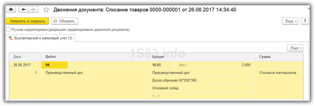 В отличие от предыдущего документа, движение сформировалось по счету 94 – «Недостачи и потери от порчи ценностей».