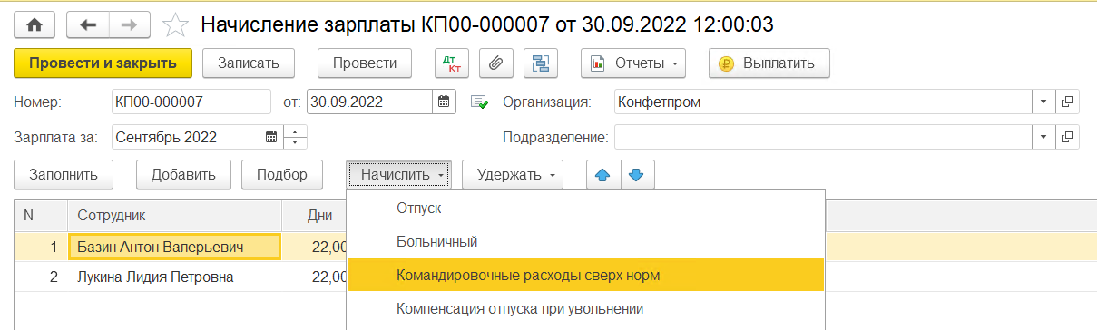 выберите из списка ранее созданный вид начисления Командировочные расходы сверх норм. В появившемся окне укажите сумму к начислению и нажмите на кнопку ОК