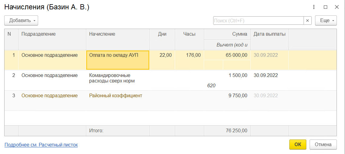 Зарплата и кадры — Настройки зарплаты — Расчет зарплаты — Начисления.
