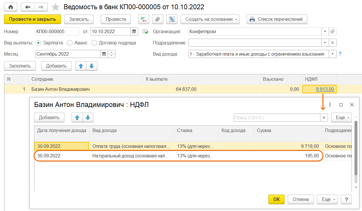 установите, т. к. данное начисление не будет выплачиваться сотруднику деньгами, но будет учтено для целей налогообложения и попадет в соответствующий отчетов по заработной плате. Кроме того, бухгалтерские проводки по таким начислениям не формируются, однако формируются проводки по НДФЛ и страховым взносам. -