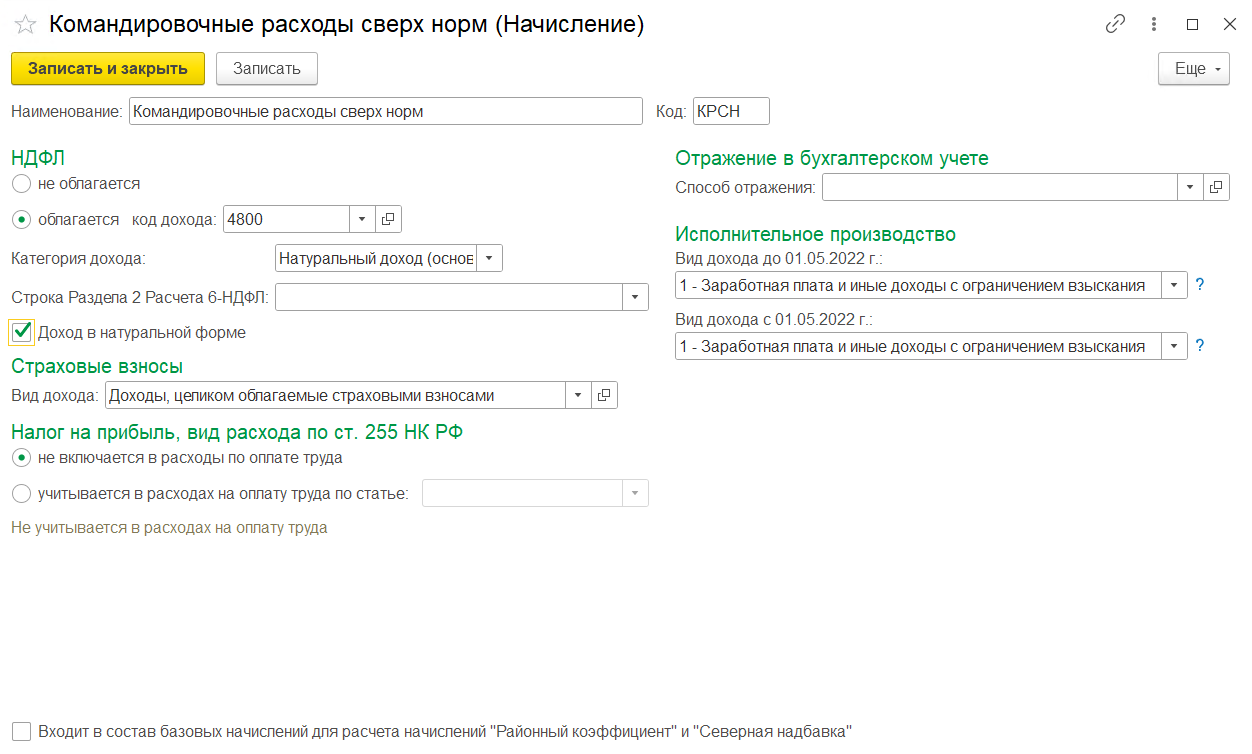 Флаг Входит в состав базовых начислений для расчета начислений Районный коэффициент и Северная надбавка устанавливается по умолчанию. В нашем примере флаг необходимо снять.