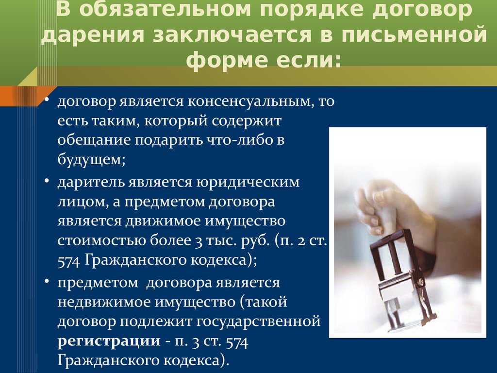 Таким образом, любые дарственные между субъектами хозяйственной деятельности коммерческой направленности на сумму больше 3-х тыс. руб. будут признаны незаконными. Но хозяйствующие субъекты могут использовать пожертвования и благотворительность. Если стоимость передаваемого объекта более 3-х тыс. руб., то стороны должны заключить соглашение в письменной форме.