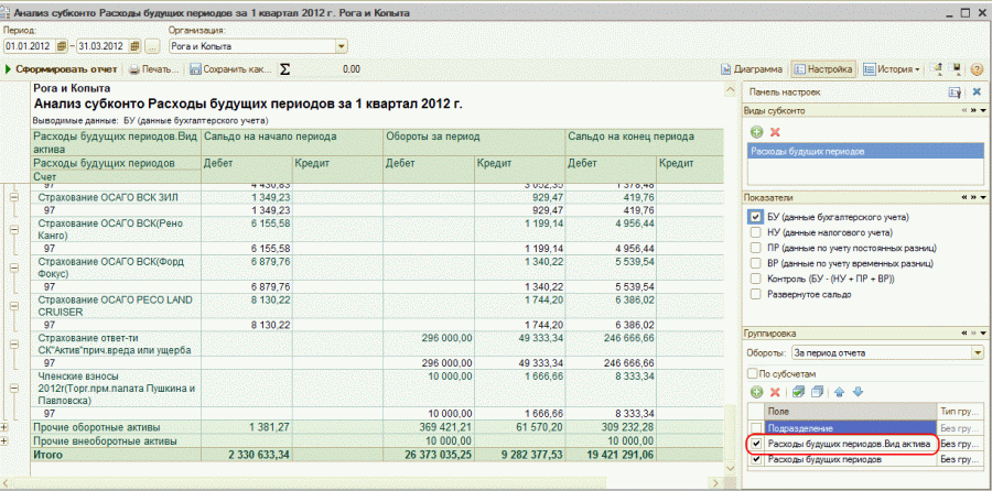 2. В качестве первой группировки указать Расходы будущих периодов. Вид актива;