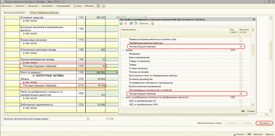 Поскольку с 2011 года организации вправе самостоятельно расшифровывать необходимые строки баланса, форма отчета Бухгалтерский баланс по умолчанию содержит только основные строки. Расшифровку строк можно настроить с помощью специальной формы Настройка расшифровки отдельных показателей бухгалтерского баланса. Таким образом можно настроить и отображение в составе активов и сумм РБП — см. рис. 2.