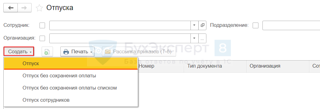 В открывшейся форме Отпуск (создание) заполните все необходимые поля, затем проведите и закройте документ через одноименную кнопку.