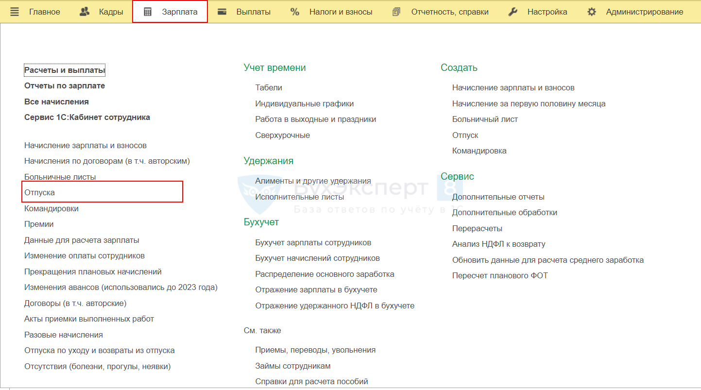Чтобы начислить отпускные в 1С:ЗУП ред. 3.1, зайдите в меню Зарплата и выберите Отпуска.