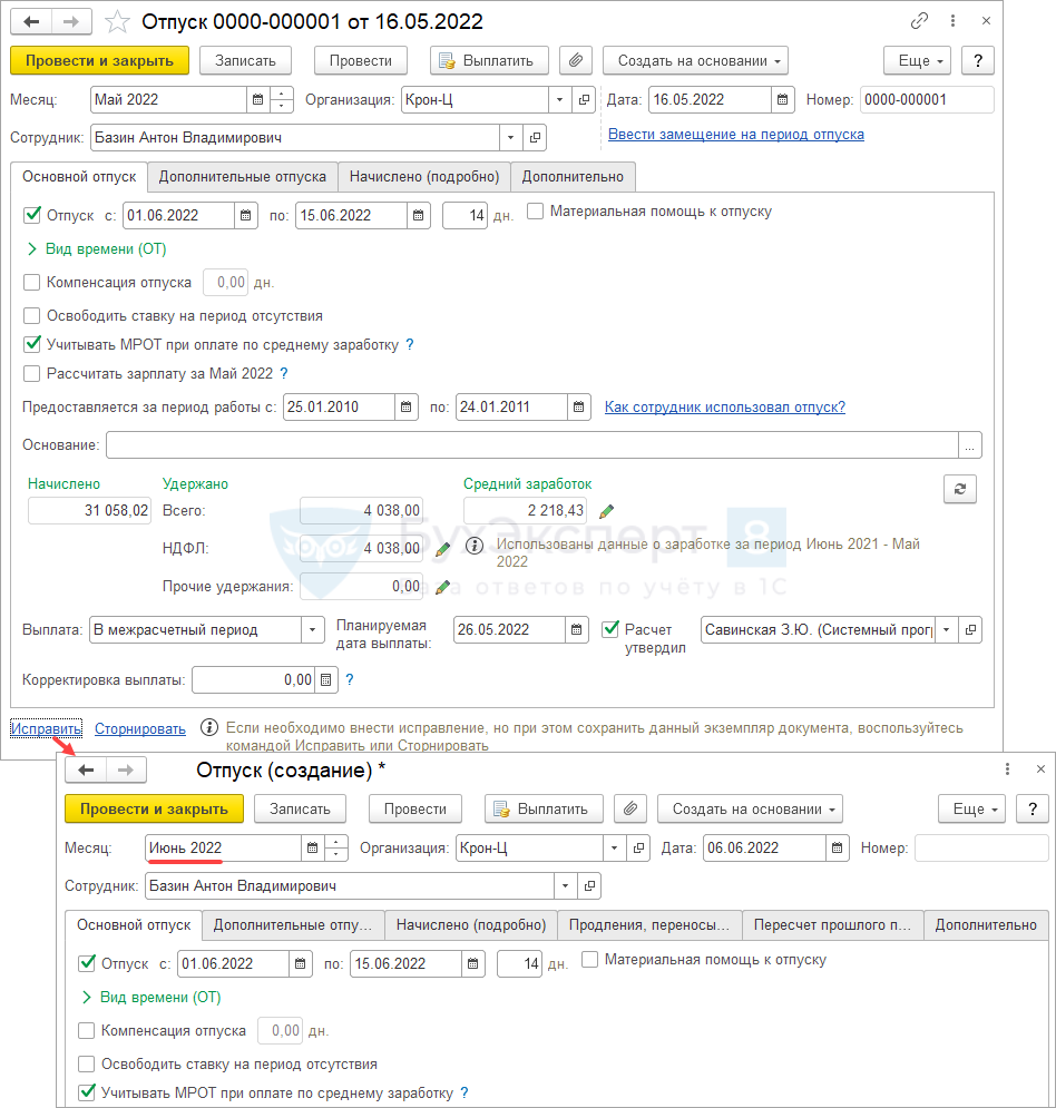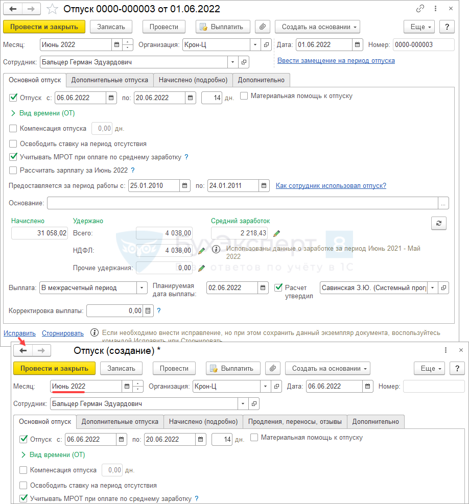 - Если месяц в документе Отпуск изначально был установлен как следующий, то и перерасчет лучше провести в том же месяце.