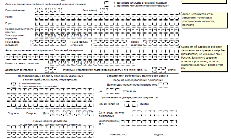 Как заполнять 3-НДФЛ? Заполнение налоговой декларации надо вести точно, указывая каждую статью дохода или расхода, с расчётом всех цифр, перепроверкой их, так как в случае наличия ошибок при рассмотрении, в принятии решения по налоговому вычету или прочим операциям может быть отказано, и документ в любом случае придёт на корректировку. Заполнению подлежат только те листы, которые актуальны к реальным операциям физлица на отчётный период. Пример заполнения 3-НДФЛ можно посмотреть по ссылке.