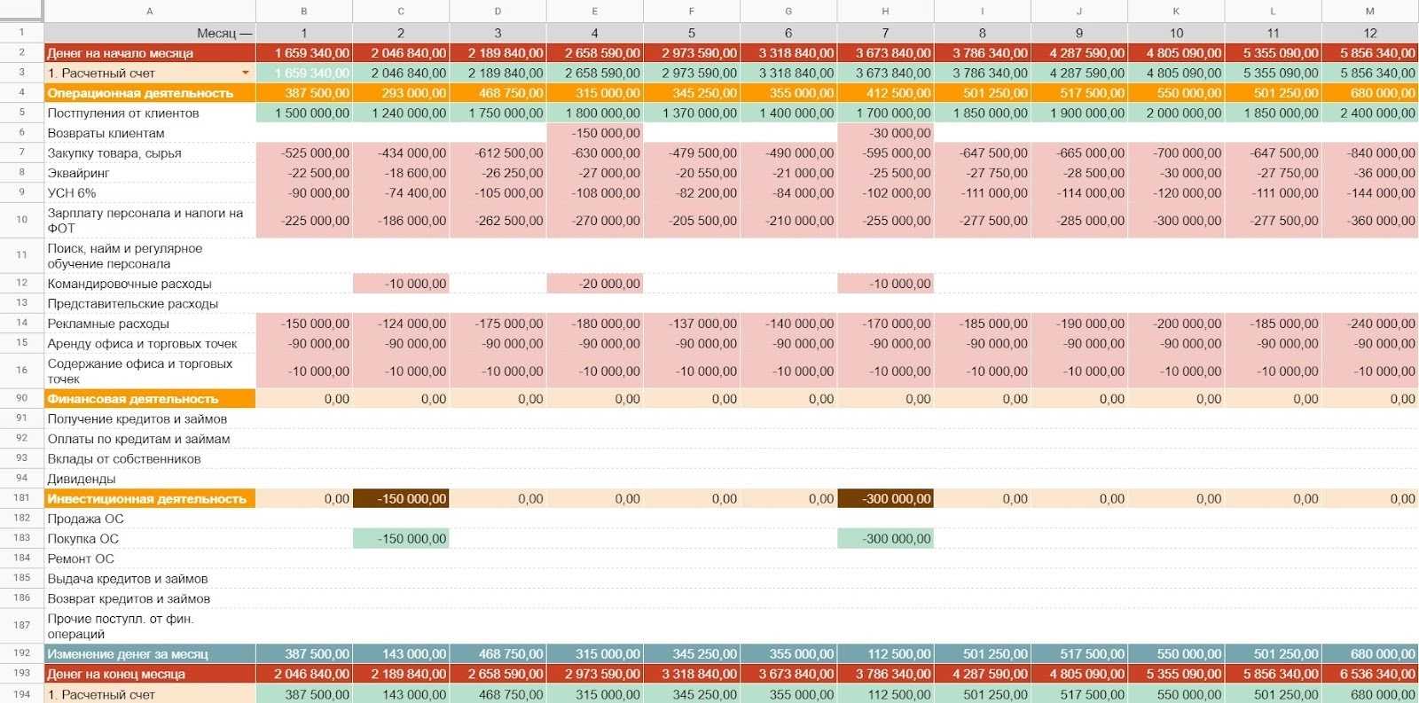 Иногда минус может быть хорошим. Проверить это легко, если предприниматель ведет ДДС и делит денежный поток на операционный, финансовый и инвестиционный. Если все хорошо, то разница между доходами и расходами по операционному денежному потоку будет положительной.