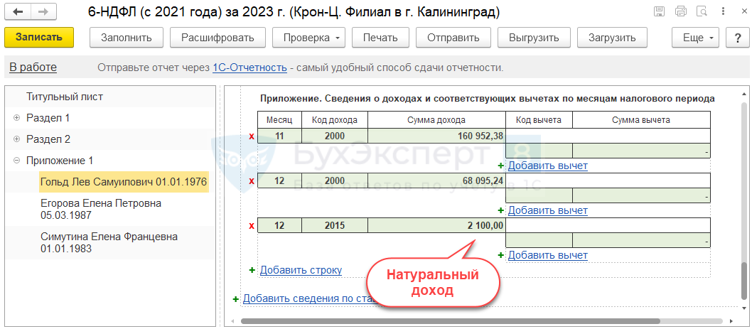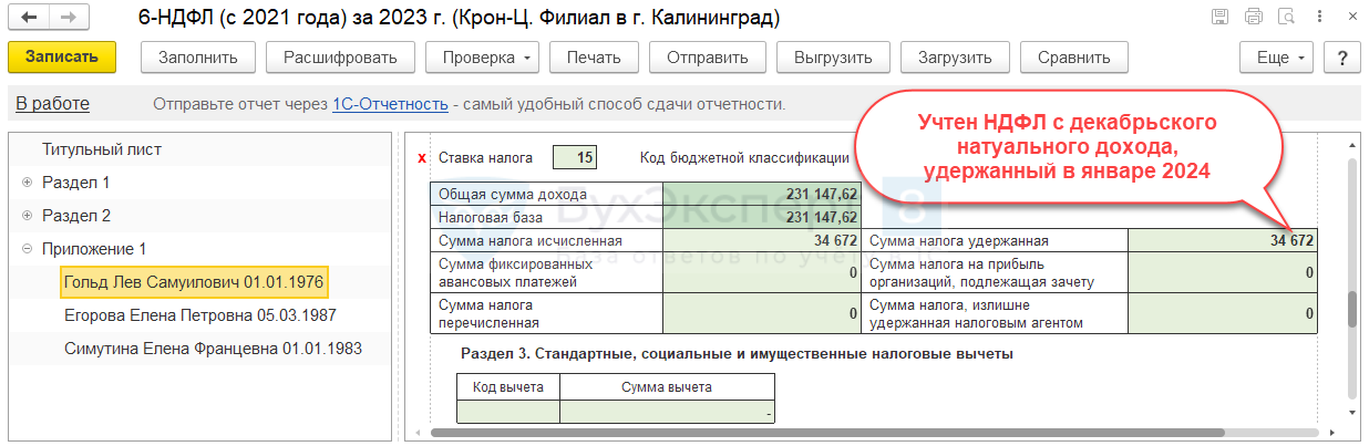А вот Приложение 1 6-НДФЛ заполняется по другим правилам – удержанный налог мы показываем в том же отчете, в который включили исчисленный НДФЛ. Поэтому, если НДФЛ с декабрьского натурального дохода и подарка удержали в январе 2024, он все равно будет учтен в Приложения 1 6-НДФЛ за 2023 год в показателе Сумма налога удержанная.