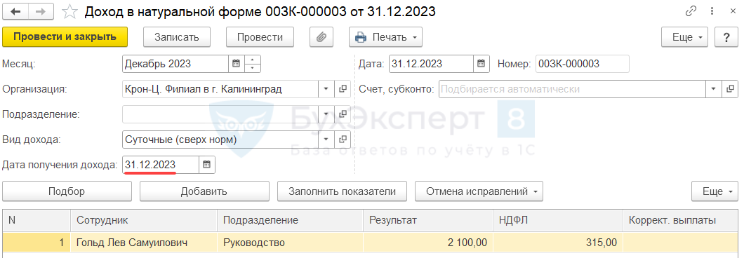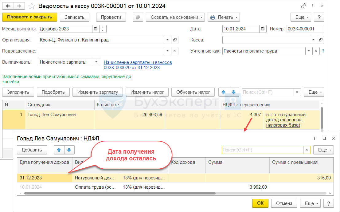 Если зарплата выплачивается в декабре, то сложностей в учете не возникает. Даже если дата получения натурального дохода или подарка позже даты выплаты зарплаты, проблем не будет. Например, суточные за декабрь отразили на дату получения дохода 31.12.2023. При выплате зарплаты 29.12.2023 НДФЛ с суточных попадает в Ведомость и отражается корректно.