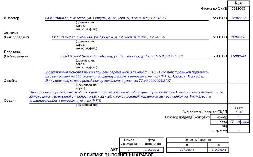 Итак, сначала заполняются строки, касающиеся инвестора, если таковой имеется, заказчика и подрядчика. Здесь нужно вписать их полные наименования с указанием организационно-правового статуса (ИП, ООО, ЗАО, ОАО), а также контактные данные: адрес их местонахождения и телефон. Напротив каждой организации вписывается код ОКПО, указанный в регистрационных документах.