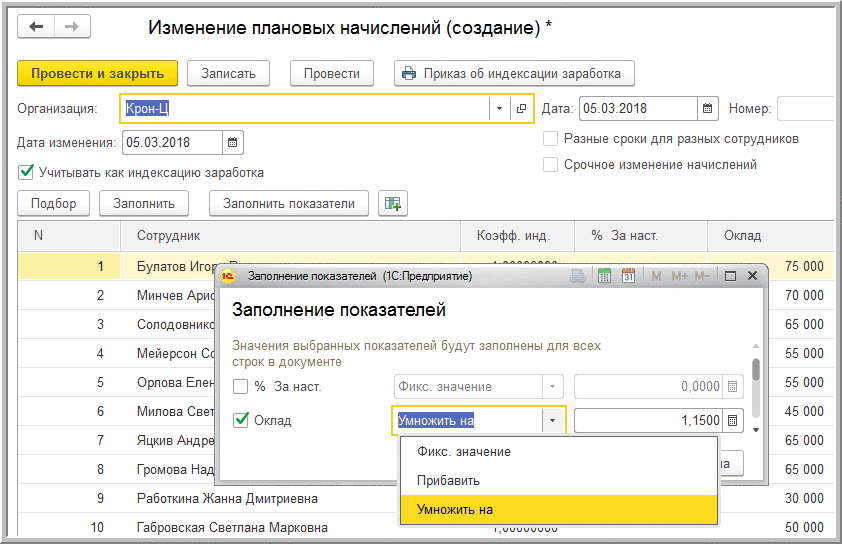 Этот флаг доступен в документе, если включена возможность использования механизмов индексации заработной платы флагом Выполняется индексация заработка сотрудников (меню Настройка — Расчет зарплаты). Используя кнопки Подбор или Заполнить, необходимо сформировать список сотрудников, заработок которых подлежит индексации. Далее, по кнопке Заполнить показатели в документе Изменение оплаты сотрудников открывается окно, где можно ввести фиксированные значения (Фикс. значение — см. рисунок 2), или пересчитать предварительно заполненные с помощью математических операций (Прибавить, Умножить на), указав, к примеру, коэффициент, на который следует умножить Оклад, Часовой тариф или другой показатель, определяющие состав совокупной тарифной ставки. По кнопке Приказ об индексации заработка формируется печатная форма приказа об индексации заработка сотрудников.