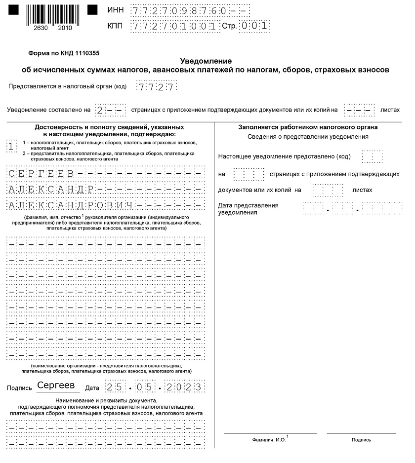Титульник уведомления стандартный для всех документов. Так, в нем необходимо заполнить сведения о налогоплательщике: ИНН, КПП для предприятий, указанный на свидетельстве о постановке на учет (все российские компании указывают КПП код «01» в 5 и 6 разряде). А также вверху страницы надо указать код ИФНС, в которую подается документ. Чуть ниже необходимо написать Ф.И.О. лица, ответственного за подачу документа, а также, на скольких листах составлен документ.