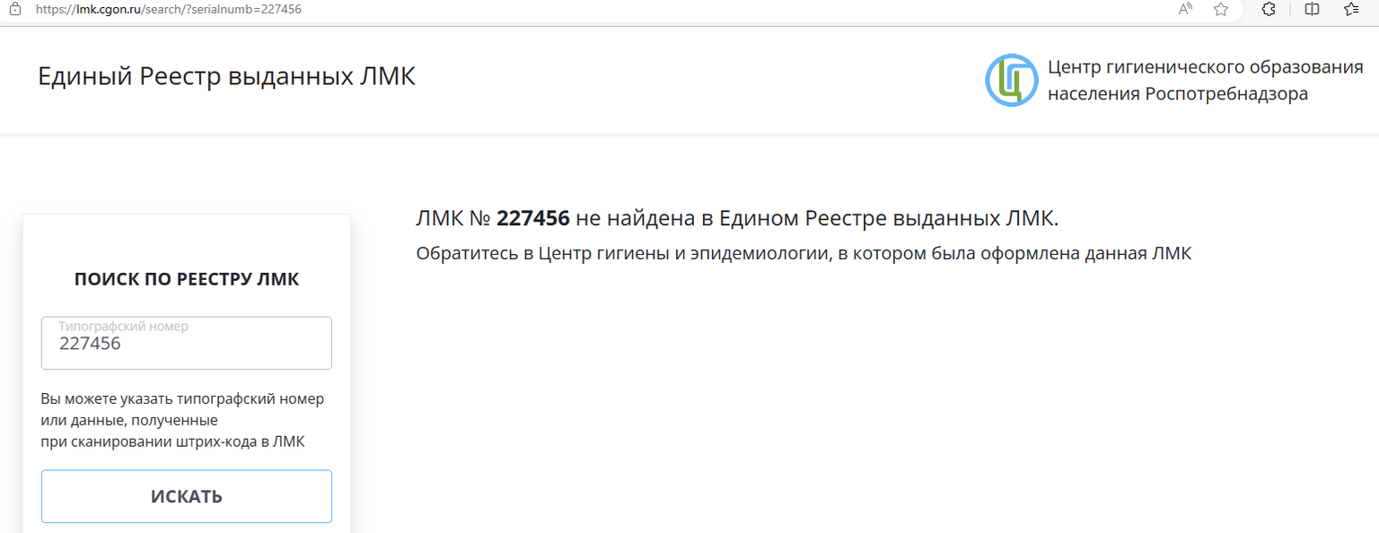 Например, я купила для себя книжку в переходе. № ЛМК 227456. Захожу на сайт Единого Реестра выданных личных медицинских книжек (https://lmk.cgon.ru/) и вижу, что это – подделка.