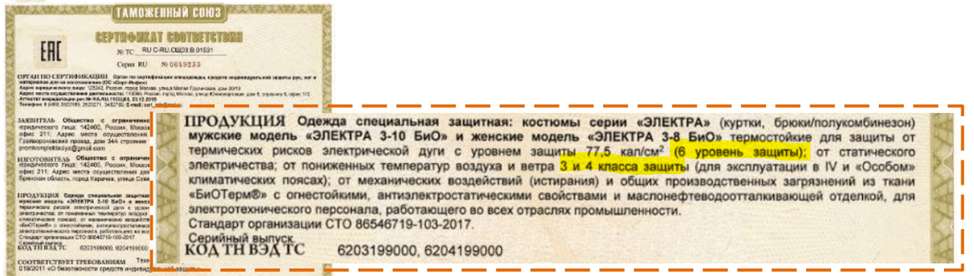 Также нормы должны содержать сведения об эксплуатационных уровнях защиты (если это предусмотрено для данного типа СИЗ). Эти сведения указаны в декларации или сертификате на СИЗ. Вот пример: