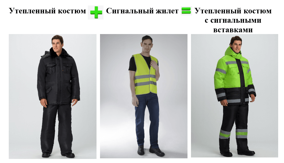 Плюсы: защита лучше, так как сигнальный жилет может расстегнуться, попасть в движущиеся элементы. Костюм с сигнальными вставками содержит в себе не только функции по светоотражению верхней части тела, но и нижней. Капюшон также обеспечен сигнальной расцветкой. В отзывах о таком костюме работники написали: «нет мороки с застежкой жилета, и чужой его не схватит по ошибке».