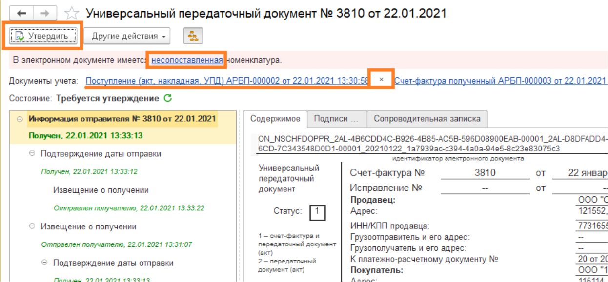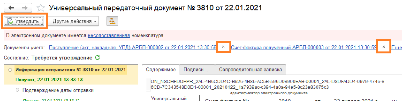 Если нужно прервать связь электронного документа и документа поступление, нажмите на крестик.