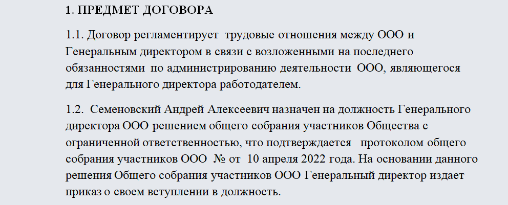 Образец договора с ген. директором обязательно имеет следующие реквизиты: