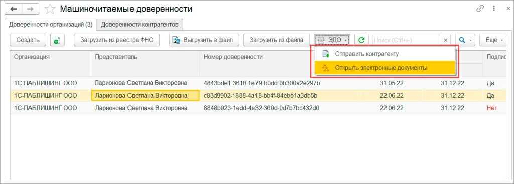Также в программе есть возможность просмотреть все документы, подписанные конкретной машиночитаемой доверенностью. Сделать это можно, выделив машиночитаемую доверенность и нажав команду ЭДО – Открыть электронные документы.