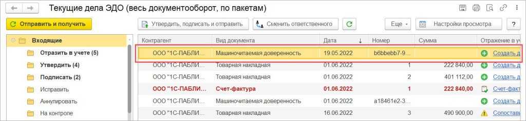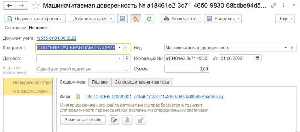 После заполнения информации данный электронный документ нужно отправить по соответствующей кнопке Подписать и отправить. Такой документ имеет вид Машиночитаемая доверенность и на стороне получателя распознается как Машиночитаемая доверенность (только в программе 1С).