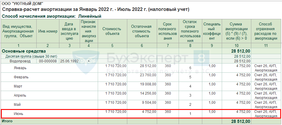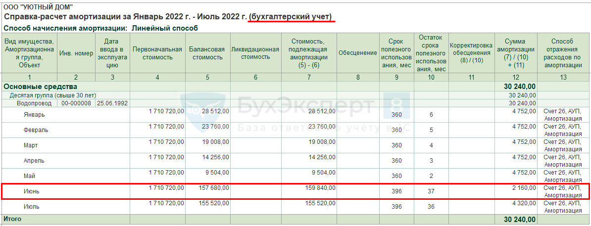 Амортизация за период с января по июнь начислялась неверно в размере 4 752 руб. (1 710 720 руб. : 360 мес. = 4 752 руб.). А должна была начисляться, исходя из нового СПИ в размере 4 320 руб.: