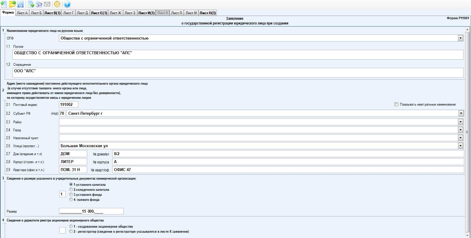 Бланк P11001 состоит из формы Заявления и прилагаемых Листов А — Н. Чтобы оформить регистрацию ООО следует заполнить Заявление и Листы В, Е, И, Н.
