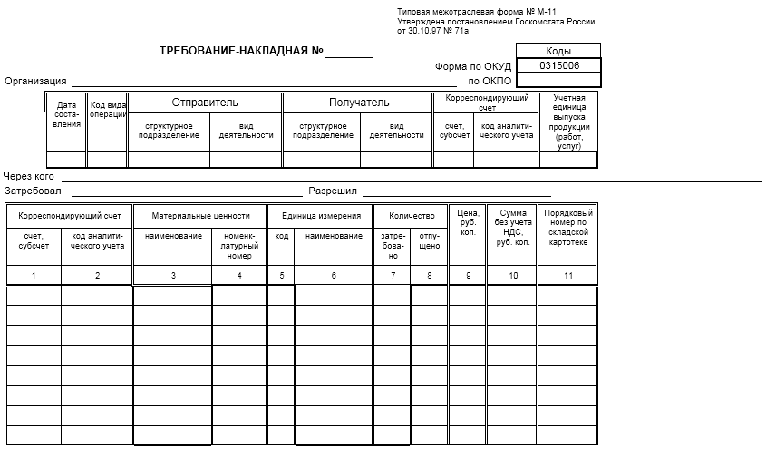 Требование-накладная – документ, заполняемый материально ответственным работником, отпускающим изделия второй стороне. М-11 готовится в двух копиях, одна служит основанием для списания ТМЦ со склада, откуда они убыли, вторая – подтверждением для оприходования имущества или товаров на склад, куда они прибыли.
