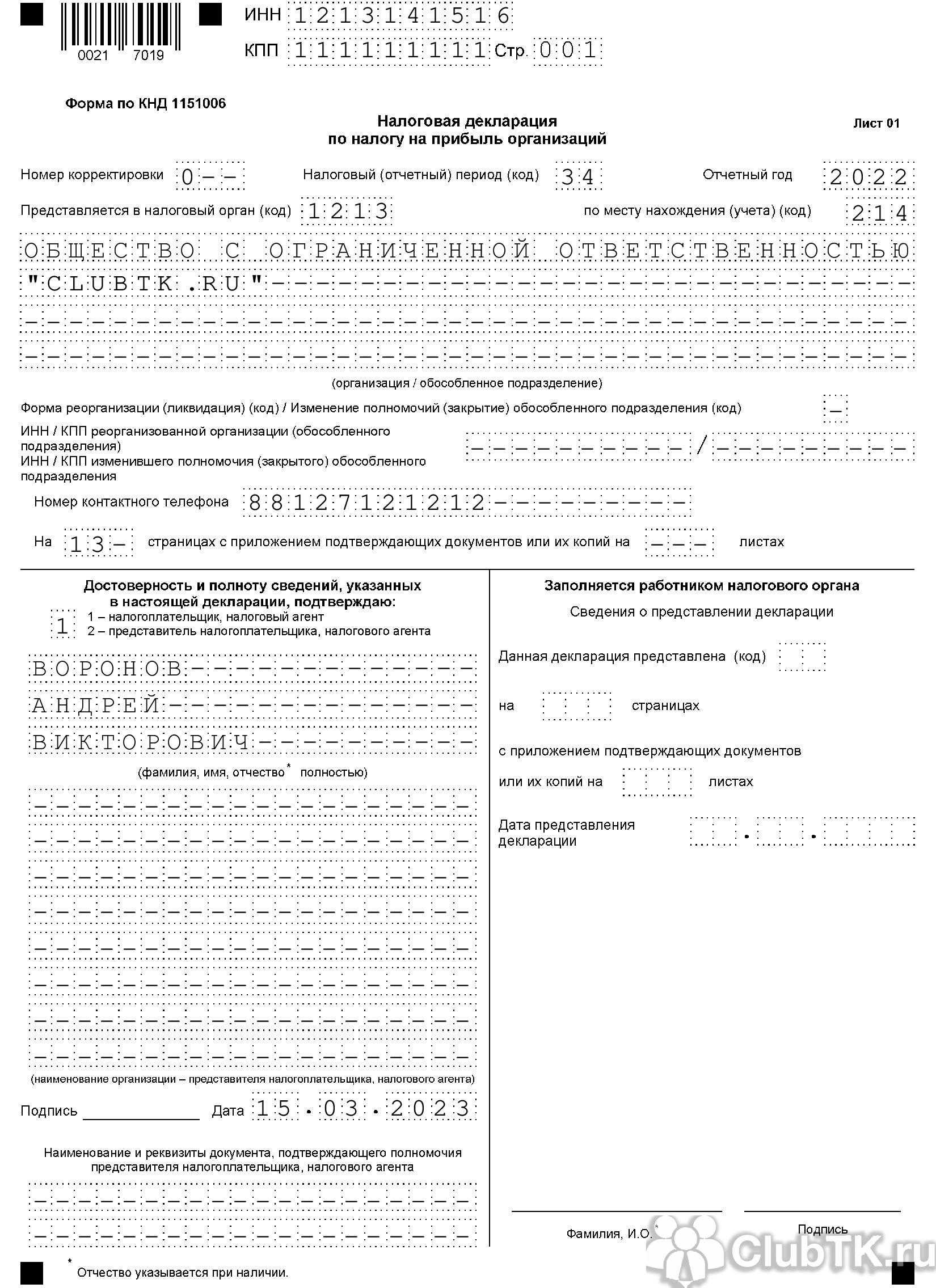 Так выглядит образец примера заполнения декларации по налогу на прибыль за 2022 год для юридических лиц в части титульного листа: