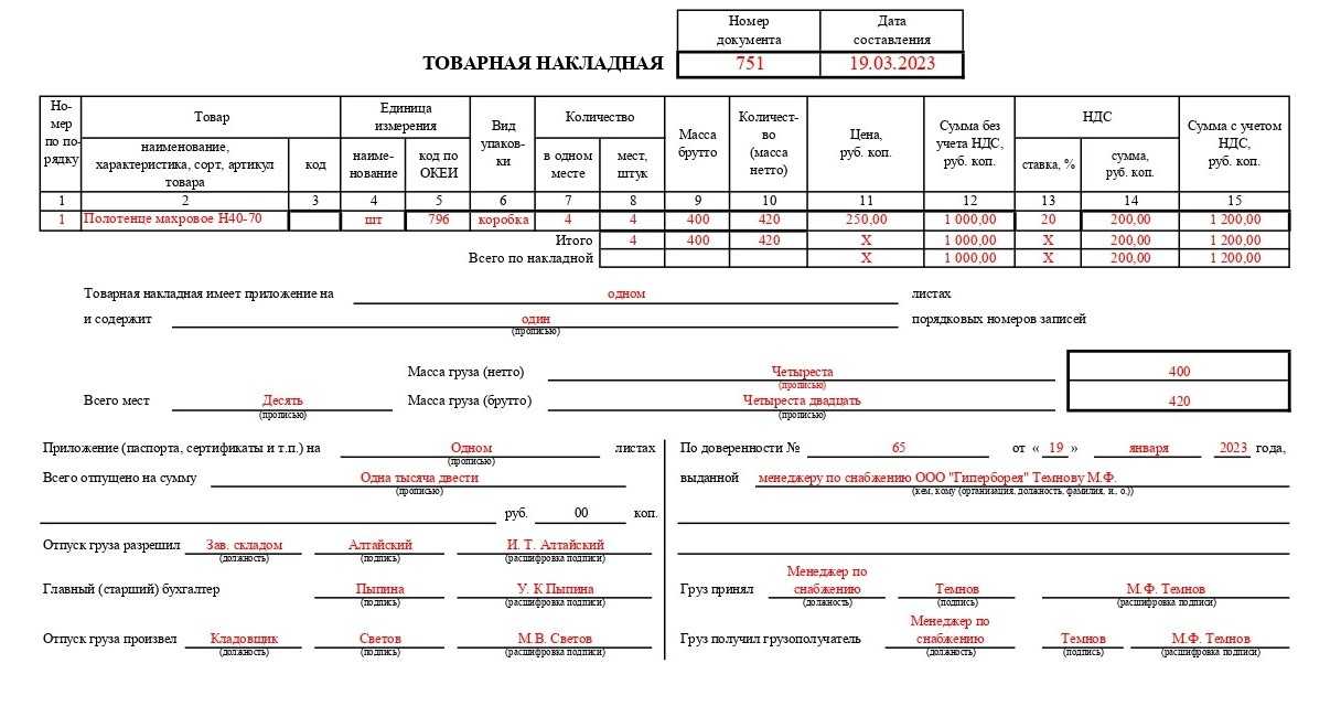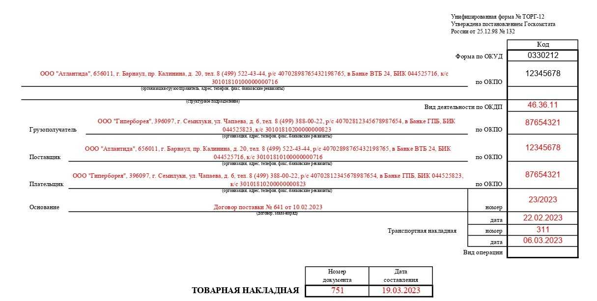ТОРГ-12 (установленный образец) или альтернативная версия, соответствующая требованиям законодательства.