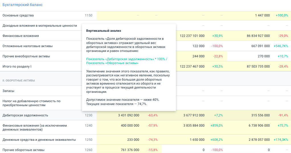 Бухгалтерский баланс, отчет о прибылях и убытках. Рост показателей система автоматически выделит зеленым цветом, падение — красным: считать вручную ничего не надо.