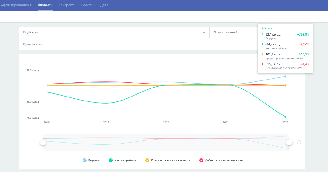 График. Позволяет в динамике посмотреть, как менялась выручка, чистая прибыль, задолженности.