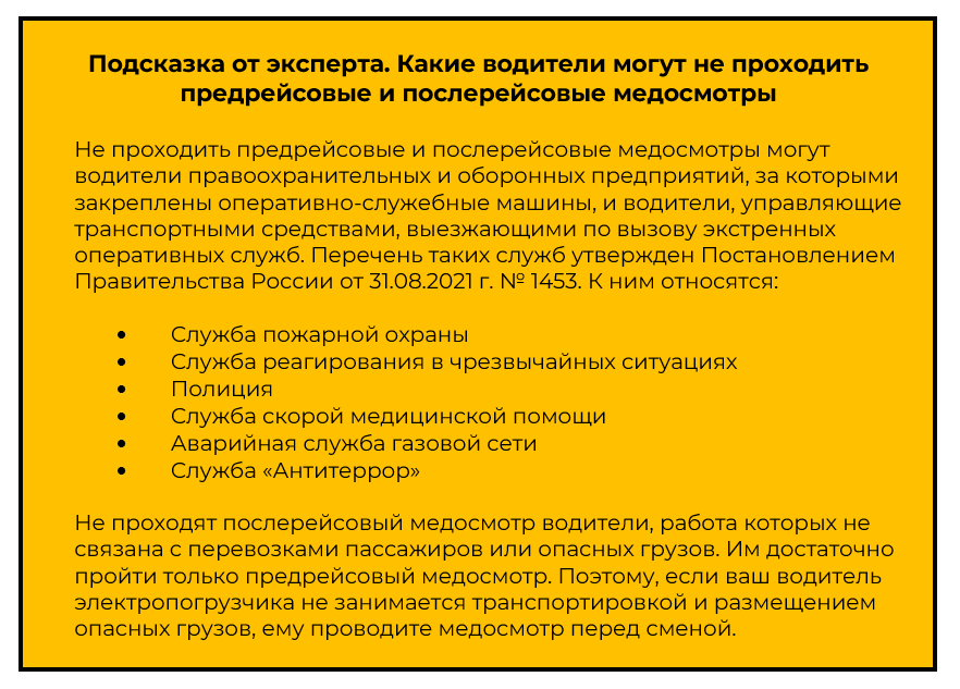 Указанные работники должны проходить предрейсовый и послерейсовый медосмотр только очно. Это связано с предупреждением рисков травматизма в ДТП детей и организованных групп пассажиров. Перевозка опасных грузов также связана с высоким риском, поэтому водители должны также проходить медосмотр лично, без применения дистанционных технологий.