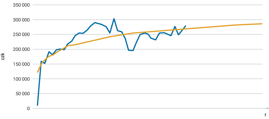 - построили графики выручки по факту. Используя линии тренда и прогнозные темпы роста выручки в долгосрочной перспективе, формировали план-график выручки для каждой точки на пятилетнюю перспективу (пример см. на рис 2);