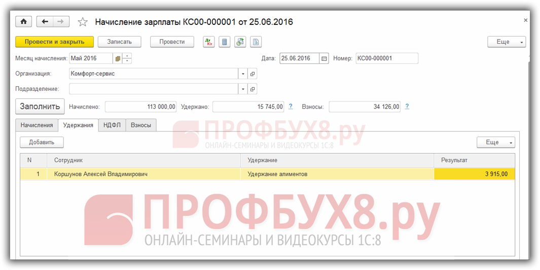 Теперь, после настройки в 1С 8.3 Бухгалтерия и занесения всей необходимой информации, удержание алиментов будет происходить в автоматическом режиме при начислении зарплаты. Покажем на примере как это будет происходить.