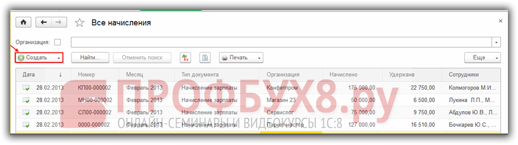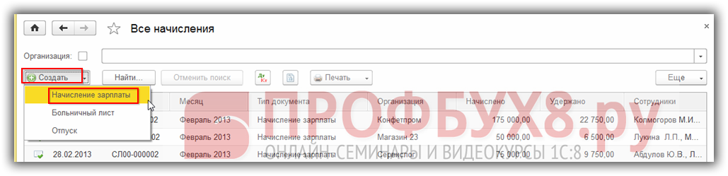 Ежемесячно формируется документ Начисление зарплаты. Найти его можно перейдя Зарплата и кадры – Зарплата –Все начисления. Нажав на данную ссылку, перейдем в журнал Все начисления. Для создания начисления жмем Создать: