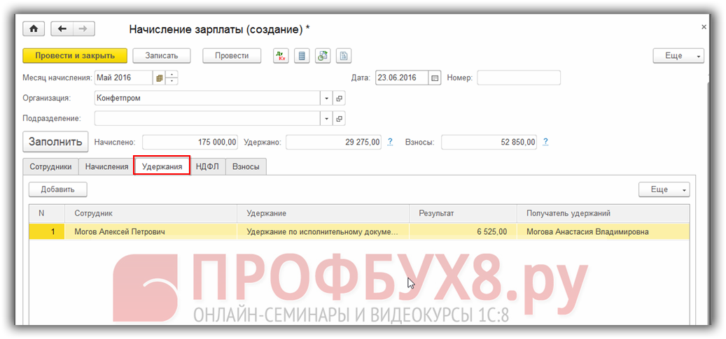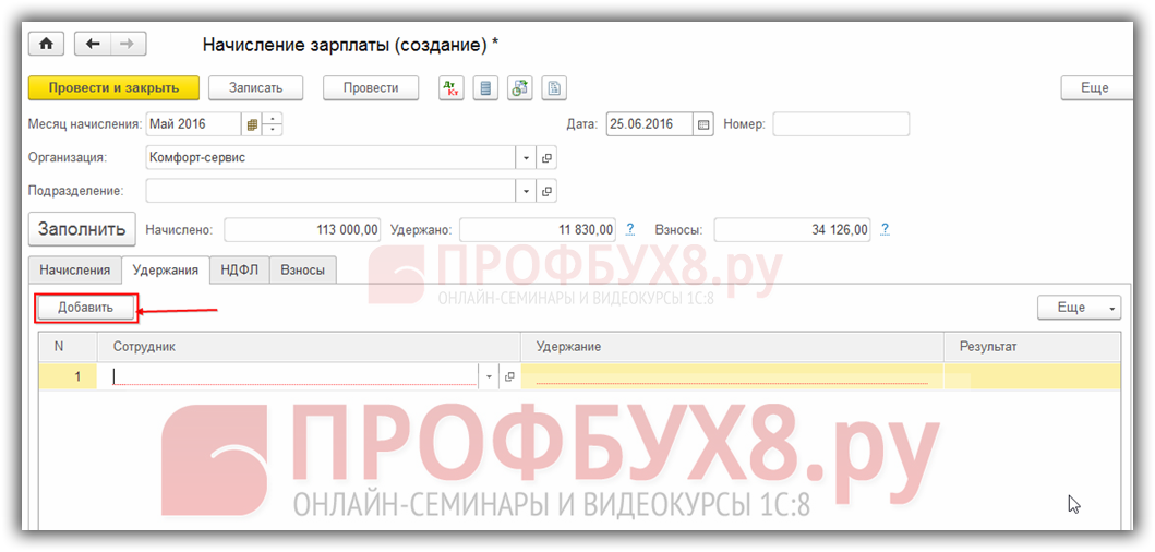 - Сотрудник – из справочника Сотрудники выбираем с кого будет осуществляться удержание;
