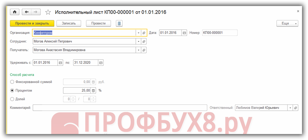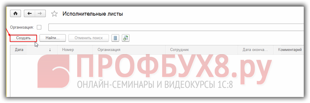 Заполним документ Исполнительный лист в 1С 8.3 Бухгалтерия: