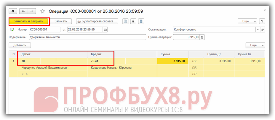 Вручную создаем проводку по алиментам в 1С 8.3 Бухгалтерия – Дт 70 Кт 76.41 на сумму удержания. Заполняем необходимые субконто: у 70 счета – это сотрудник, а у 76.41 – контрагент-получатель. Проводим документ, нажав Записать и закрыть: