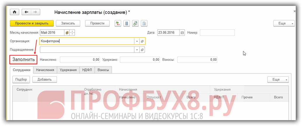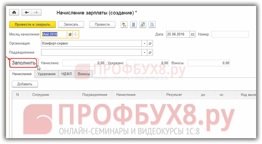 Заполним месяц начисления, организацию и подразделение (если не указать, то начисление произойдет по всем подразделениям) и нажмем на Заполнить: